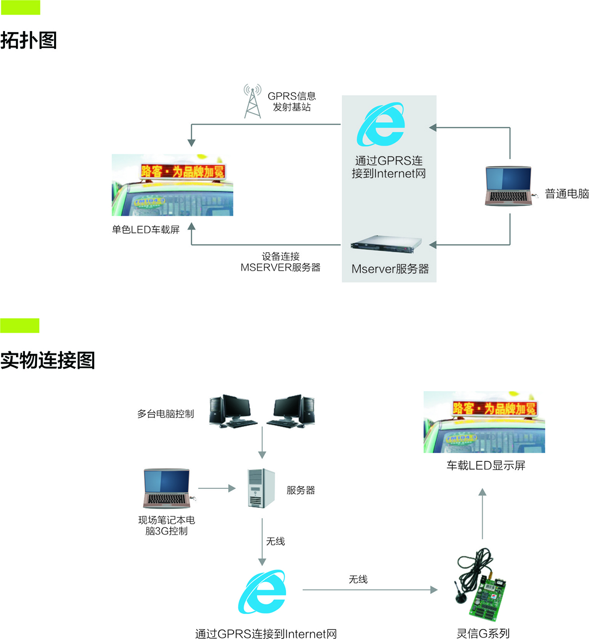 出租車車載無線LED顯示屏系統主要由車載LED顯示屏、無線LED控制卡、LED顯示屏控制軟件組成。配合城市出租車管理系統,可以顯示車輛信息,線路以及氣象,公告,廣告等媒體信息。
